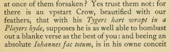 Yes trust them not: for there is an upstart crow, beautified with our feathers, that with his Tygers hart wrapt in a players hyde, supposes he is as well able to bombast out a blanke verse as the best of you: and Beeing an absolute Johannes factotum, is in his owne conceit the onely Shake-scene in a countrey.