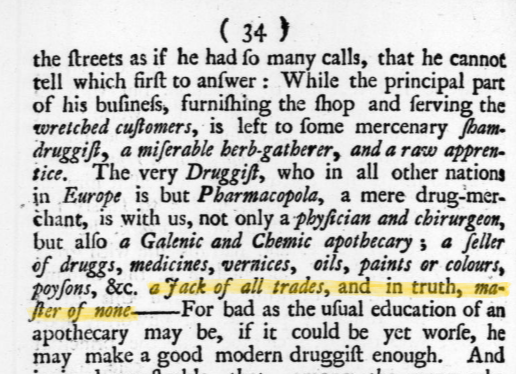 According to Gary Martin of Phrase Finder, the earliest example of the phrase “jack of all trades, master of none” is from a 1785 pamphlet written by Charles Lucas called Pharmacomastix, or the Office, Use, and Abuse of Apothecaries Explained. (Note: when I looked it up, I learned the pamphlet was actually published in 1741).
